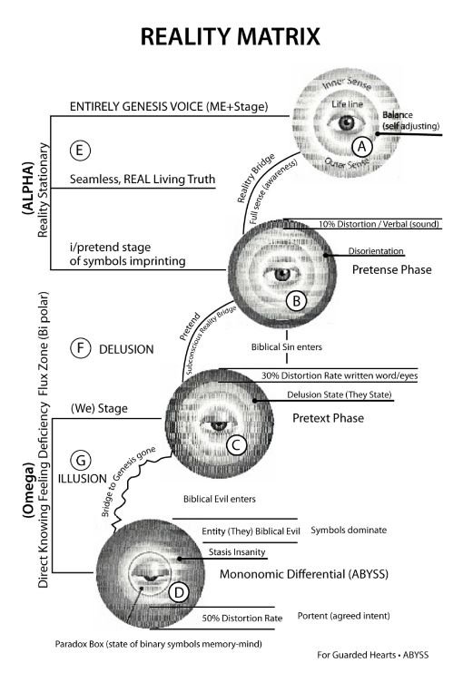The Reality Matrix graph is a visual representation of man’s gradual dissent from being human to becoming a symbolic robot. It depicts what happens to the organic creature being as it progresses to a symbol’s dementia stage. Humans are gifted with a bio-energy constant, in the beginning, [A], Genesis. Man communicated using the full complement of his five physical senses. Through Feeling Direct Knowing, a passive overlapping extrapolation of the physical senses, he had full access to an all knowing sixth sense [E].